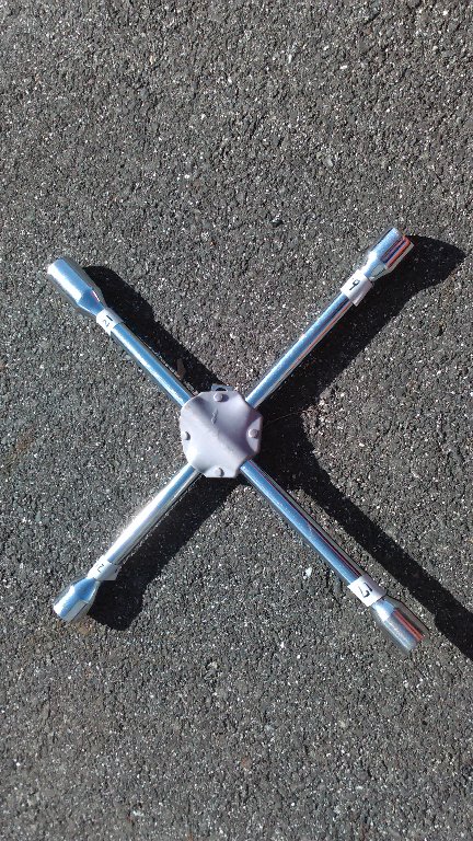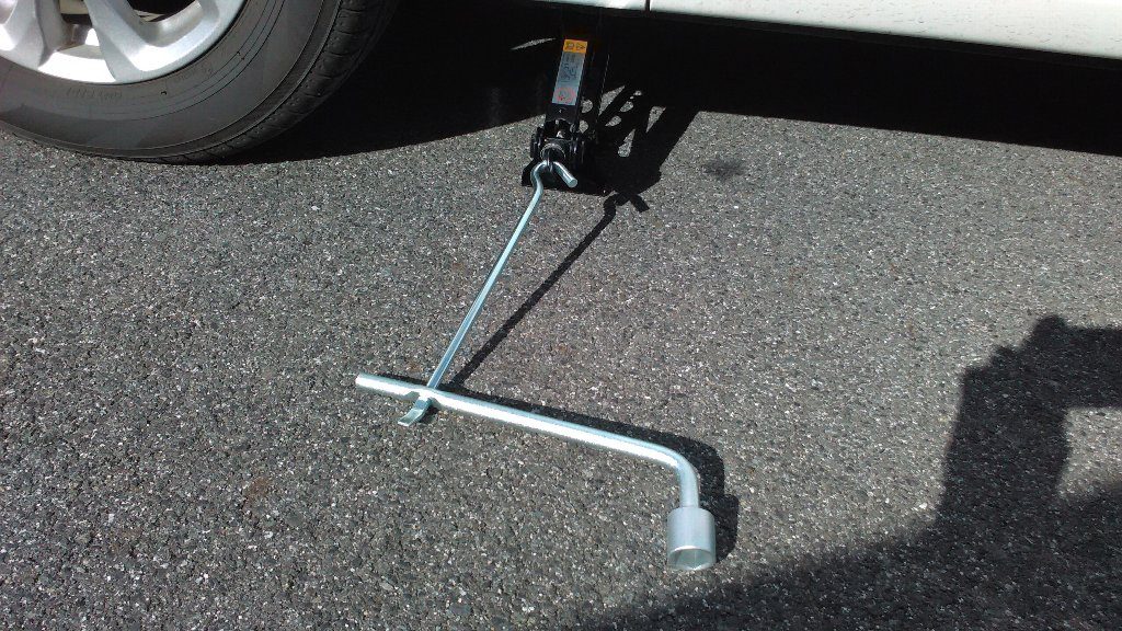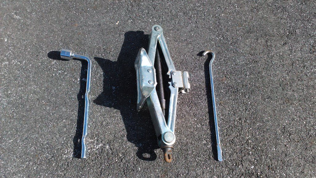 一般的な車載工具。パンタグラフジャッキとボックスレンチ。ボックスレンチはジャッキを回すのにも使います。