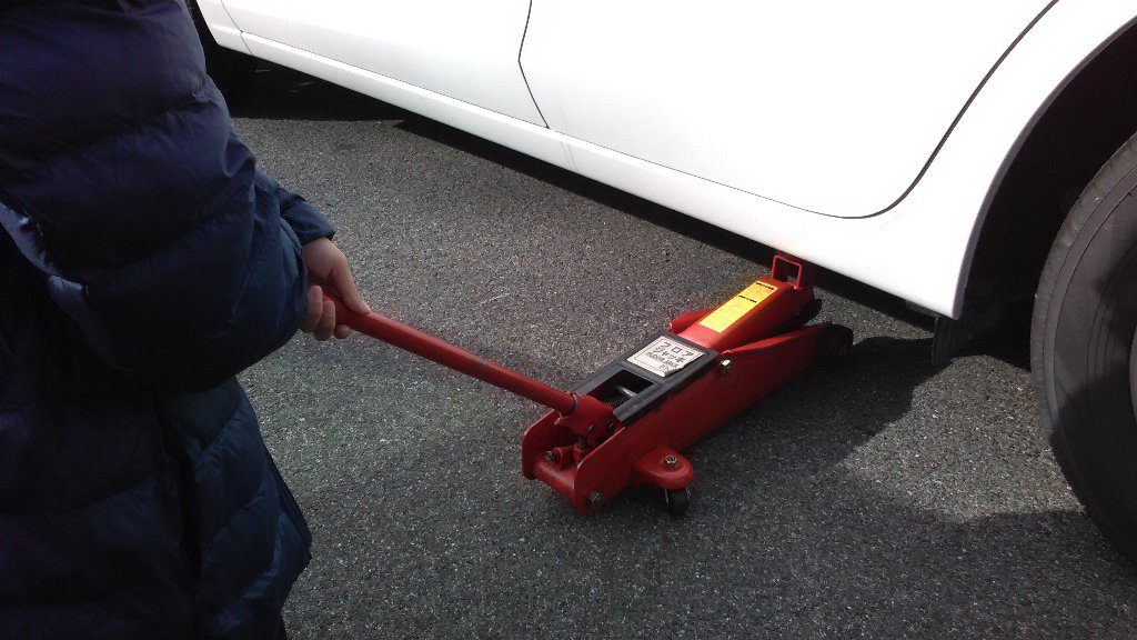 パンタグラフジャッキの場合は、ゆっくりしか回らないけど、油圧のフロアジャッキの場合は「ガタン! 」て下りるから気をつけてね!