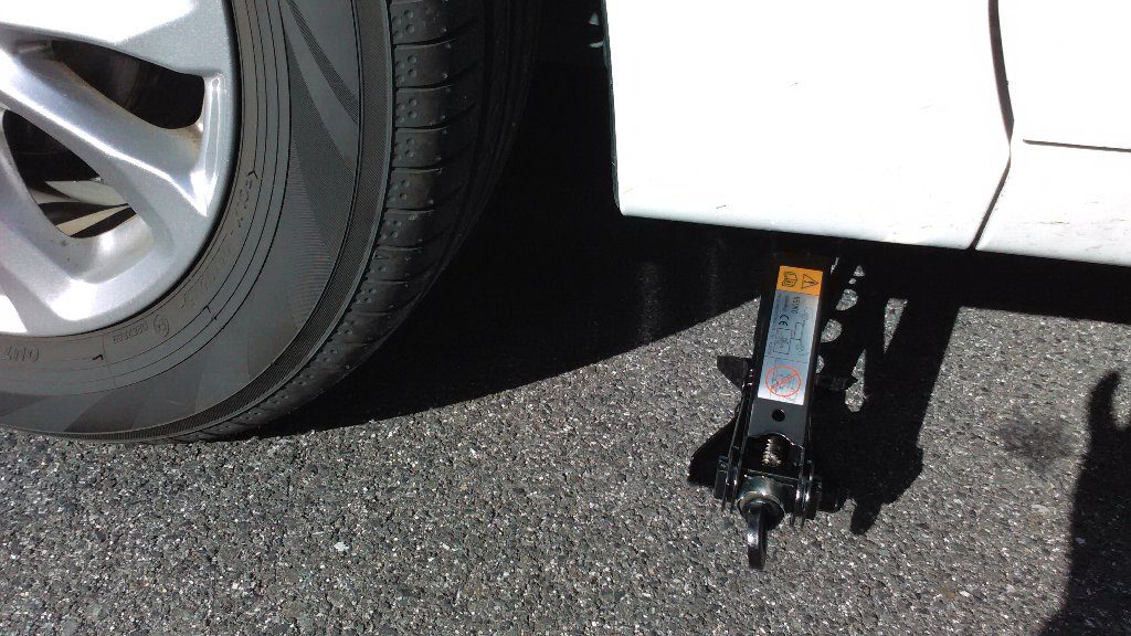 - タイヤがかろうじて地面についているくらいにジャッキを上げる。
