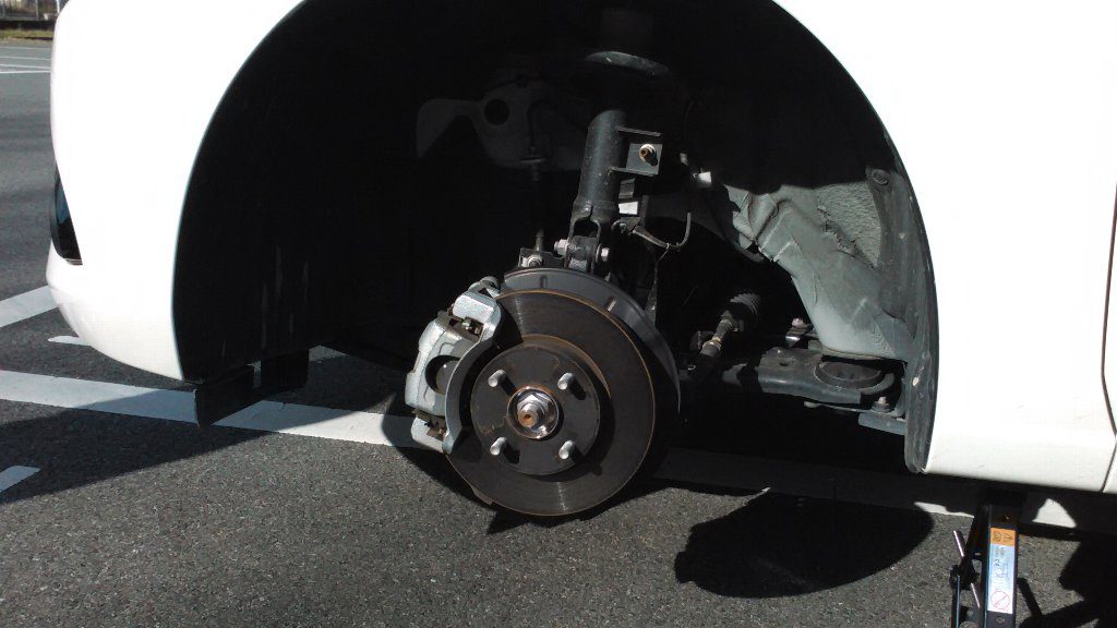 下がやわらかい地面や坂だと、ジャッキアップしてタイヤを外してるときに、車が動いたりジャッキが倒れたりすることがあります。