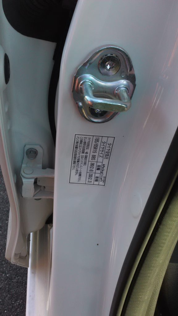 タイヤサイズと空気圧ラベル1。たいてい運転席のドアを開けたところに書いてあります。