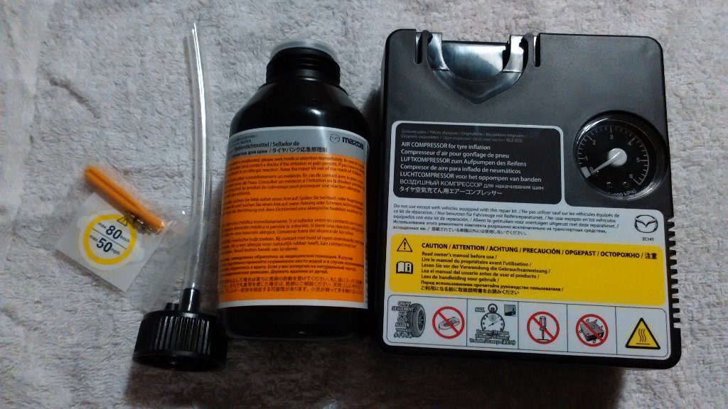 パンク修理セット。これはマツダのデミオに乗っていたものです。驚いたのは、電動ポンプがついていたこと!