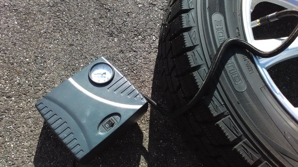 - 電動ポンプのスイッチがOFFになってるのを確認。シガーライターソケットまたは12Vソケットにさしこみ、ホースの先をタイヤのバルブに取りつける。スイッチをONにする。けっこう大きな音と振動があるのでびっくりしないように(^^) 指定空気圧は運転席のドアを開けたところに書いてあります。最大10分。それでも空気圧が上がらなければパンクの穴が大きすぎるか、バルブにきちんとはまっていないなどが考えられます。いずれにしろポンプで入れるのは諦めましょう。ふつうは2~3分あれば充分はいります。