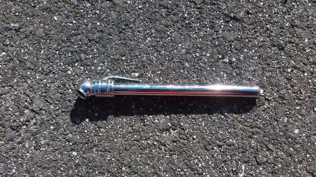 空気圧計。電動ポンプにも空気圧が表示されますがあまり当てにならないので、空気圧計で計りましょう。しっかり押しつけて一回で計らないと、なんどもプシュプシュやってると空気がどんどん抜けてしまいます(^^)